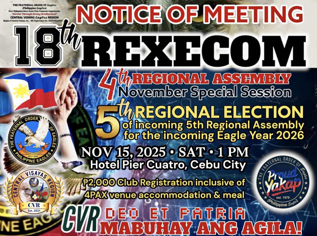 NOTICE OF 18th REXECOM & SPECIAL SESSION/ 5th REGIONAL ELECTION Central Visayas Eagles Region of TFOE (PE) Est. 1979 PARTICIPANTS: